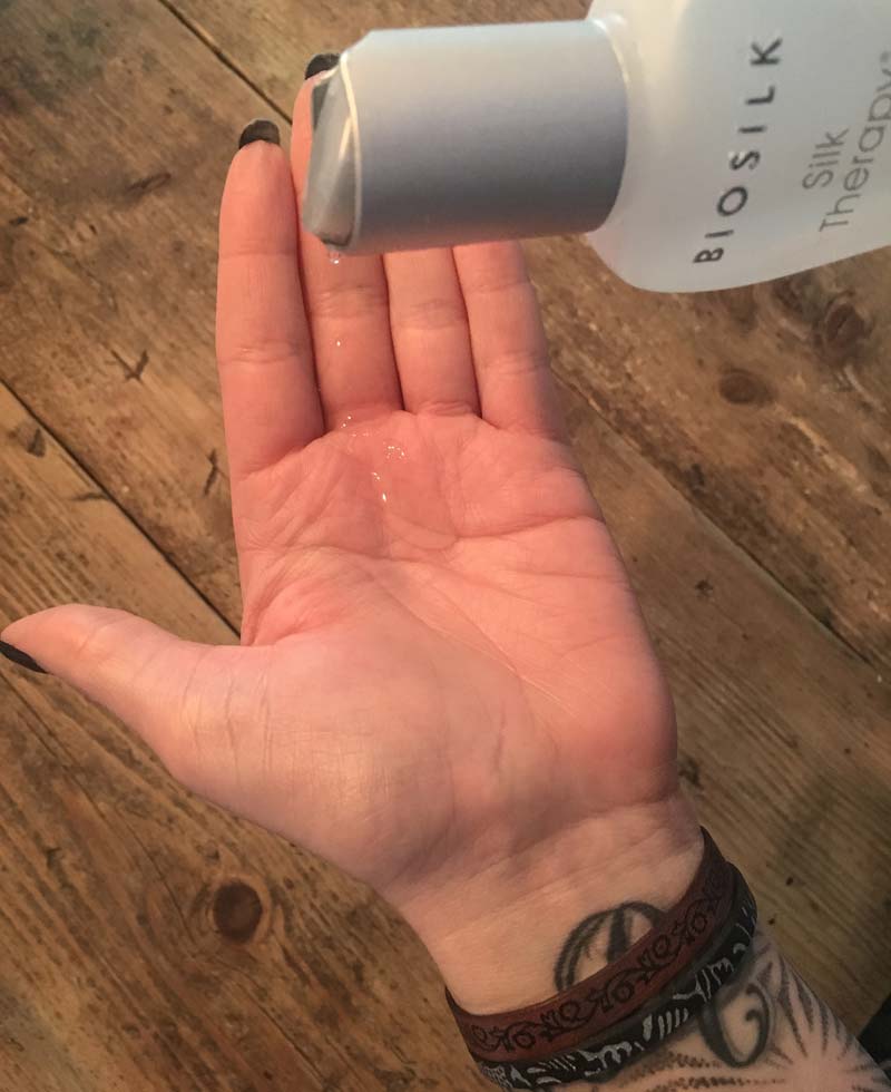 BioSilk Silk Therapy kan zowel op droog als nat (gewassen) haar gebruikt worden. Wanneer ik mijn haar gewassen hebt vind ik het heel fijn om enkele druppels van de Biosilk Silk Therapy aan te brengen in de punten van haar. Vaak gebruik ik juist de Silk i.p.v. een crèmespoeling. De Silk verzorgd en voed ook mijn punten en beschermd gelijk mijn haar tegen de föhn. Ik wapper namelijk altijd mijn haar droog na het wassen dus de bescherming tegen de föhn is een sterk pluspunt.